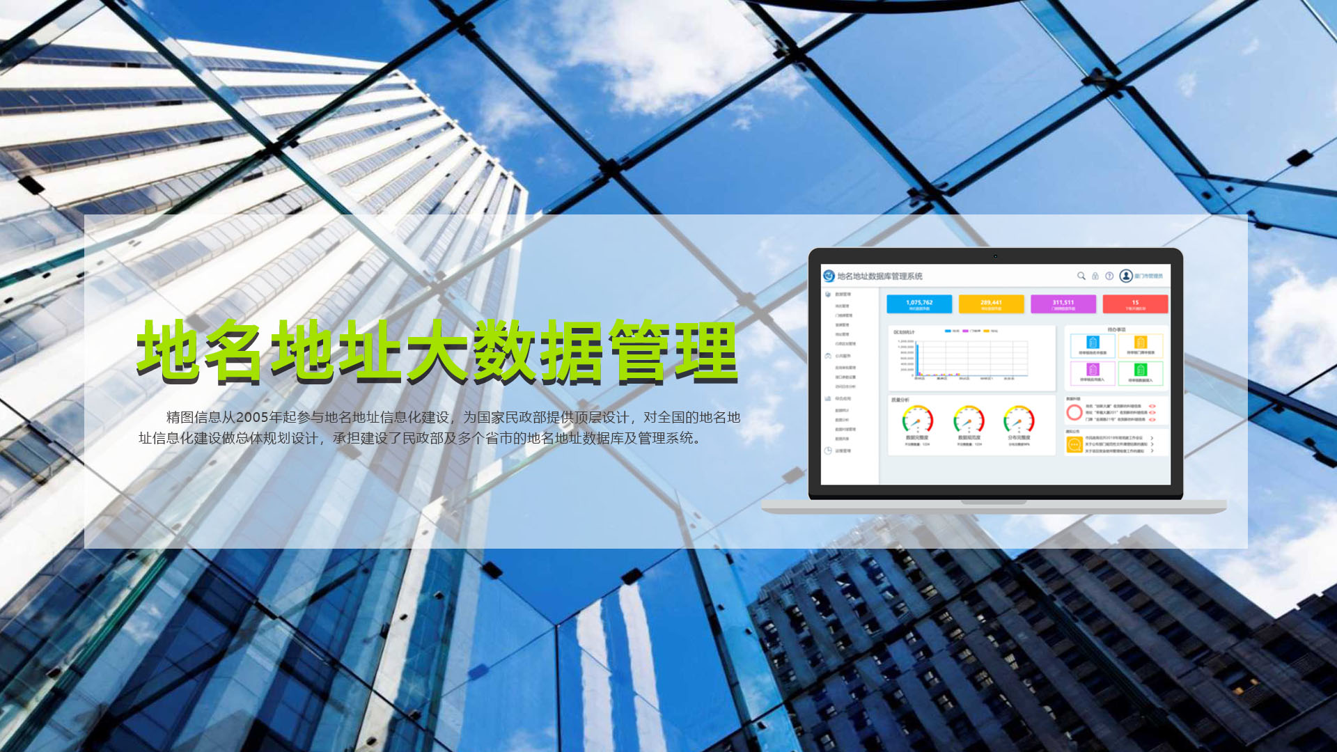創立于1999年,是北京飛利信科技股份有限公司(股票代碼:300287)子公司,是國家創新型企業、國家火炬計劃重點高新技術企業;獲批建有福建省博士后創新實踐基地、福建省院士專家工作站、廈門市院士專家工作站。精圖信息承擔了國家發改委、國家工信部、國家科技部、國家住建部、國家民政部等重大和重要專項50多項,主導和參與制定國家和行業標準、規程、導則60多項,擁有自主知識產權的專利和軟件著作權500多項。